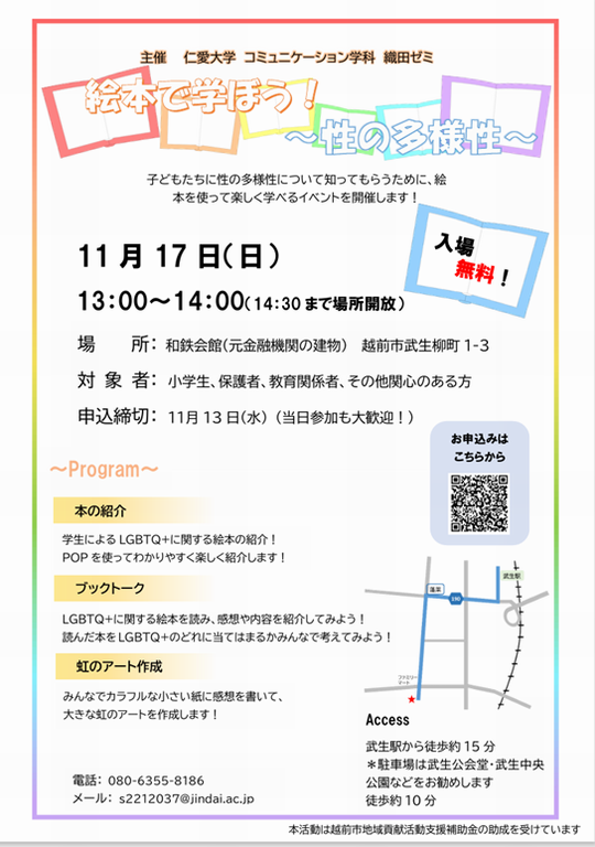内 容:子どもとその保護者を対象に、LGBTQへの理解を深めるブックトークイベントの開催