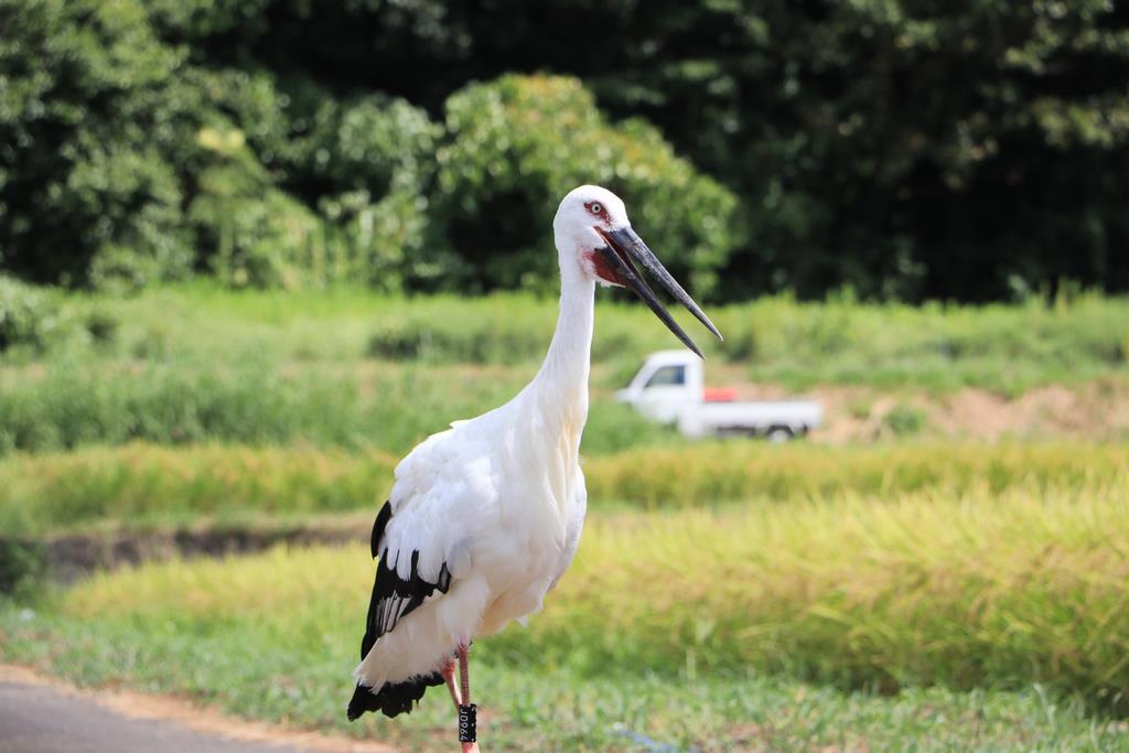 車を走らせているとコウノトリがまちなかを飛ぶ美しい姿を見かけた。有機の田んぼの稲刈りを見に行けば、4羽のコウノトリが作業中のコンバインの横で餌をくわえている。