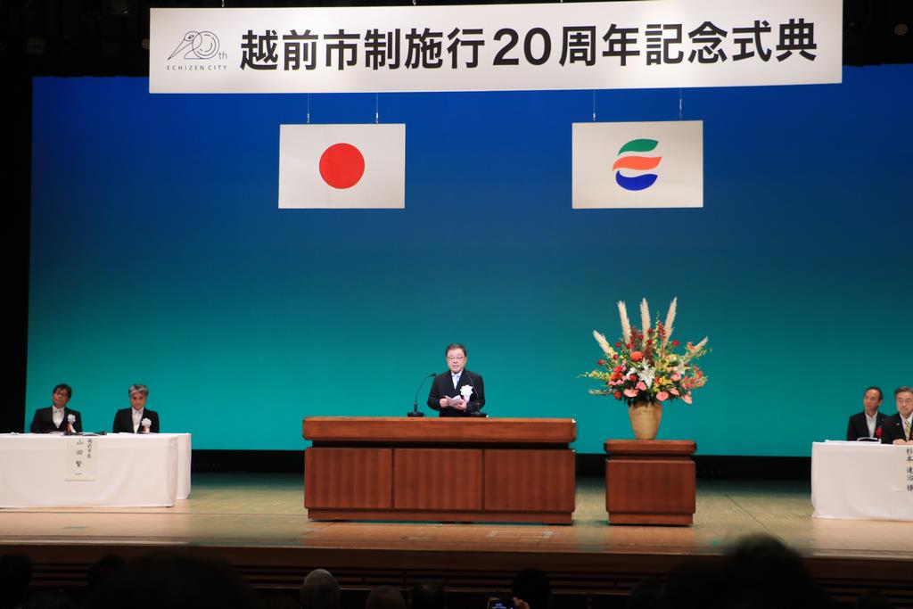 9月27日に行った越前市文化センターでの記念式典には、県内市町、ゆかりのある自治体の首長、市民など約750人が出席し、越前市の節目を祝った。