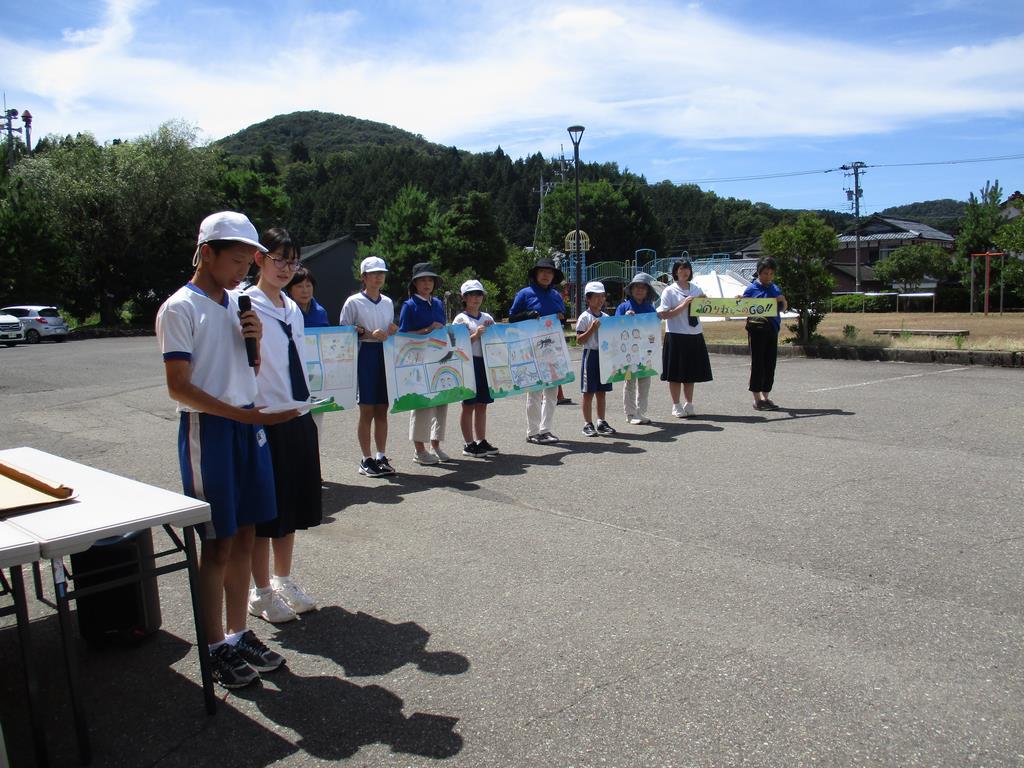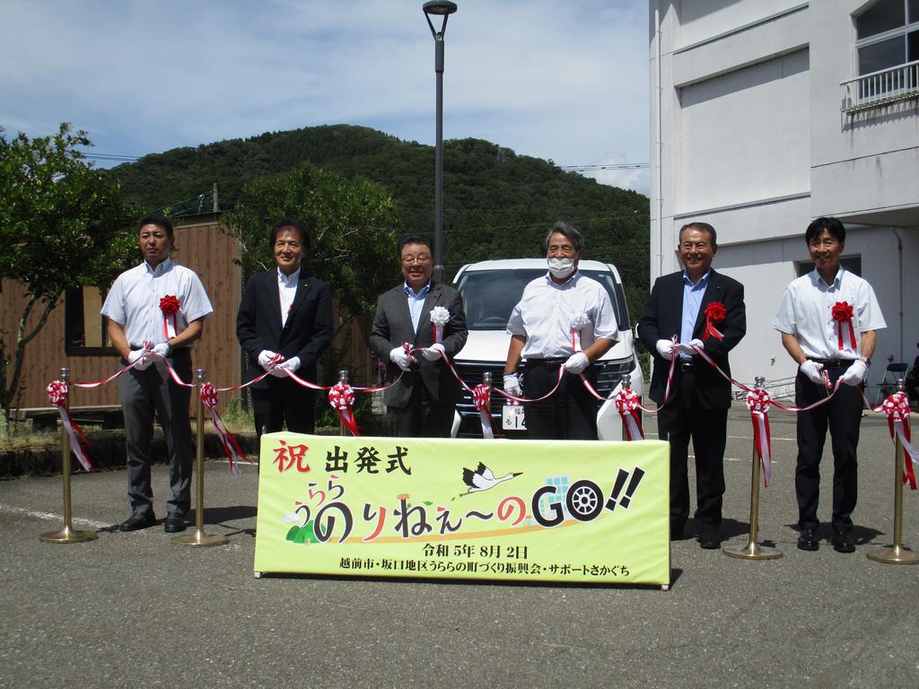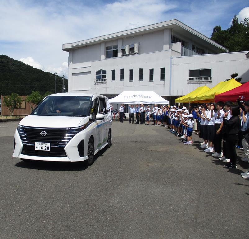 出発式では、地域の方や坂口小学校の児童の皆さま、武生第二中学校坂口分校の生徒の皆さま、先生方など、80名もの皆さまが坂口小学校の駐車場に集まり、多くの方が見守る中、「うららのりねぇ~のGO‼」が出発しました。