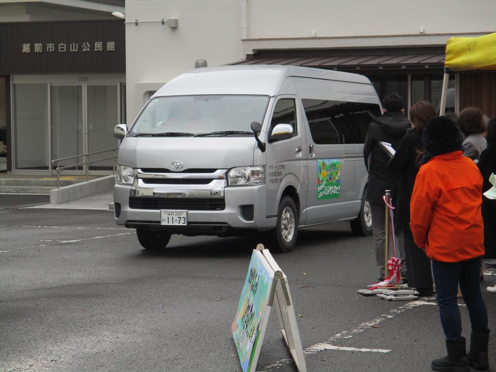 「お出かけしましょう しらやまGO! 」という愛称は、武生第五中学校 の生徒の皆さんが考えました。 車体に貼るマグネットシートの絵のデザインについては、白山小学校の皆さん、ダイナミックな文字については、越前市公認VTuberの紫式部さんが書きました。
