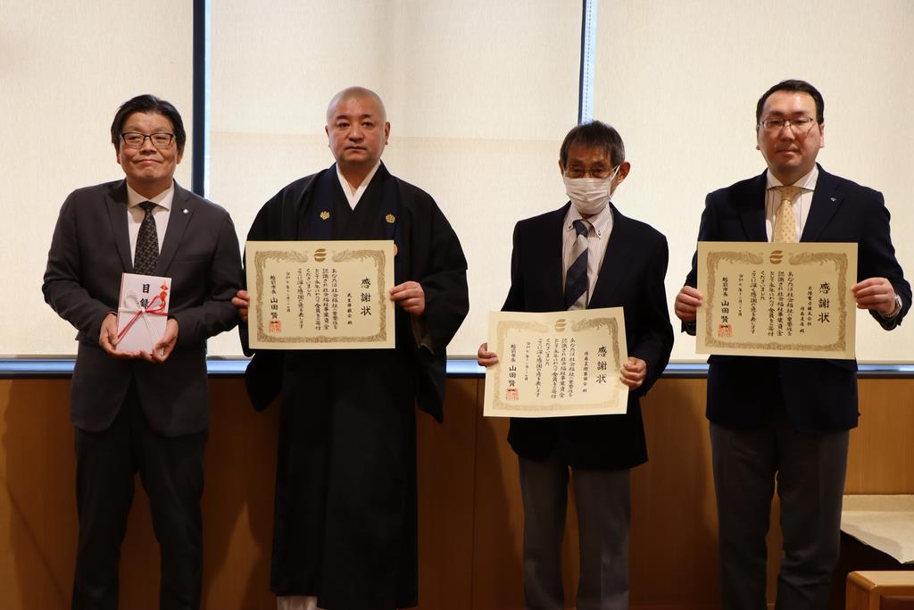 令和5年12月21日に、武生佛教会様、丹南芸術家協会様、北陸電力株式会社丹南支店様から、三者主催で令和5年11月25日から12月2日にかけてふるさとギャラリー叔羅にて開催された第49回歳末チャリティーオークションの収益金のうち11,400円を、福祉基金にご寄附いただきました。