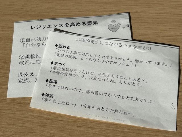 市役所の職員研修「レジリエンス~心のしなやかさを鍛える~」に参加しました。レジリエンスとは「困難にぶつかっても、しなやかに回復し、乗り越える力」「ストレスや逆境にさらされても適応し、自分の目標を達成するために再起する力」だそうです。研修に参加し、日々の業務の中で、物の見方を柔軟に変えること、自分も相手も肯定的に捉えることの大切さを感じました。 また、『心理的安全につながる小さなちょっとした声かけ』についても心に残りました。チームで仕事をしている園職員同士や、保育者等とこども・保護者との関係 などにおいて、人間関係を円滑にするための共通する大切な心掛けだと思いました。