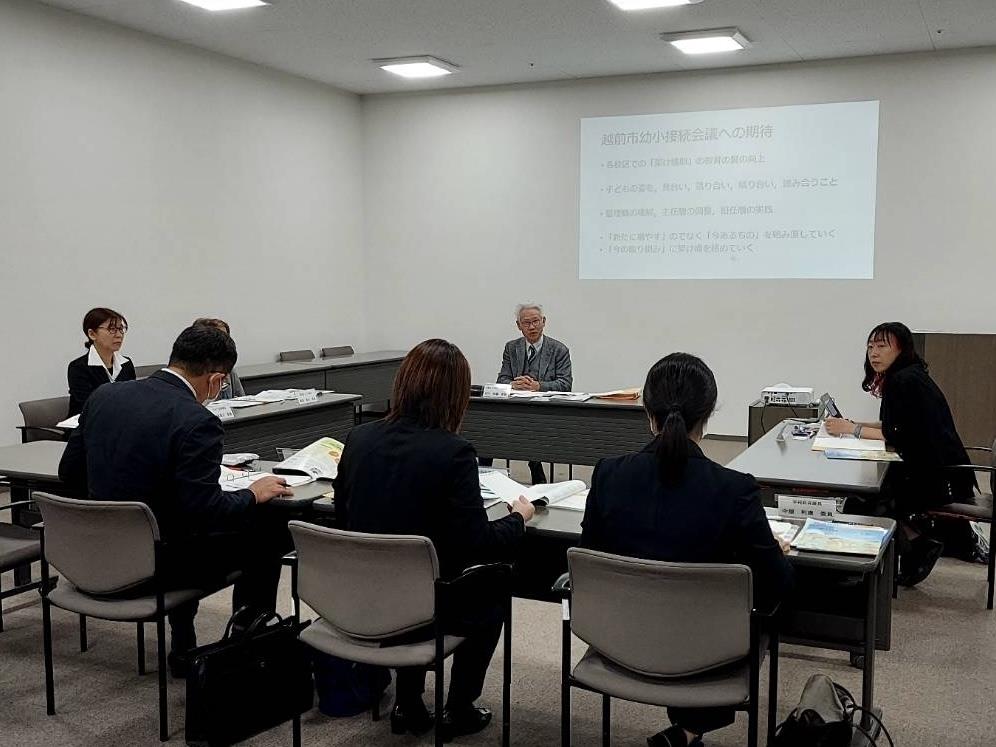 福井大学教職大学院岸野麻衣教授、仁愛女子短期大学石川昭義教授をお迎えし、越前市幼小接続推進会議を開きました。会議には幼稚園、認定こども園、小学校、行政それぞれの代表が参加し、園・学校の協働の可能性や効果的な取組について活発な意見交換が行われました。