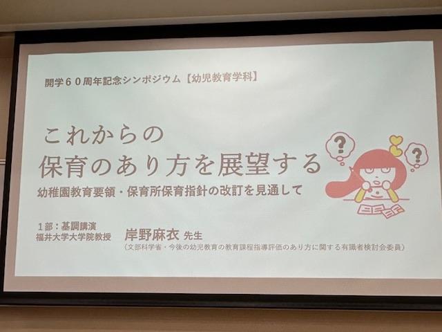 仁愛女子短期大学開学60周年記念シンポジウムに参加してきました。はじめに「これからの保育のあり方を展望する~幼稚園教育要領・保育所保育指針の改訂を見通して~ 」と題して福井大学教職大学院岸野麻衣教授の講演がありました。言葉を用いて思考を深めていくこと、協同する力の育成、多様な動きを体験することに重点が置かれているとのお話でした。講演の後、仁愛女子短期大学の石川教授、増田教授、川崎准教授を交えてディスカッションが行わました。保育現場の先生方の意見も聞かれ、多くのことを学ばせていただきました。