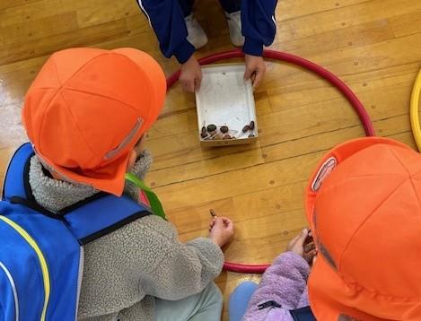 武生東小学校1年生の「秋のおもちゃランド」に、校区の園(浪花認定こども園、認定東こども園、恩恵幼稚園)から5歳児が遊びに行きました。はじめに全員でどんぐりマラカスで演奏しながら「虫の声」を歌いました。どんぐり玉入れや松ぼっくりけん玉、どんぐりボーリングなど、1年生が生活科の学習でつくった秋の遊びを楽しみました。帰りには葉脈を写して作ったしおりのプレゼントももらいました。