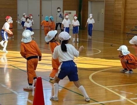 次は1年生が計画した遊びです。こども園の子が楽しいと思えるようにとみんなが知っている遊び「こおり鬼」「ドッジボール」「だるまさんが転んだ」を選んだとのこと。3年生に遊んでもらった時の経験を生かしてビブス(ゼッケン)でチーム分けをしました。ビブスを着けた5歳児は「園にないものがあった。着られてうれしい!」と誇らしげでした。