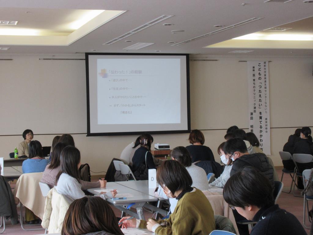 講師には小児科医の津田明美先生をお迎えし、こどものコミュニケーションの発達や、日々の生活の中で「わかる」「つたわる」を促す関わり方等についてお話しいただきました。