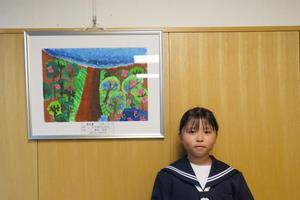 現在南越中学校3年生の本好美結さんが描かれた「校門から見た景色」の絵が飾られています。
