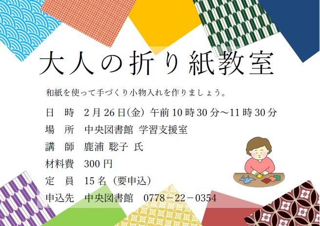 *中央図書館*「大人の折り紙教室」を開催します 令和3年2月6日