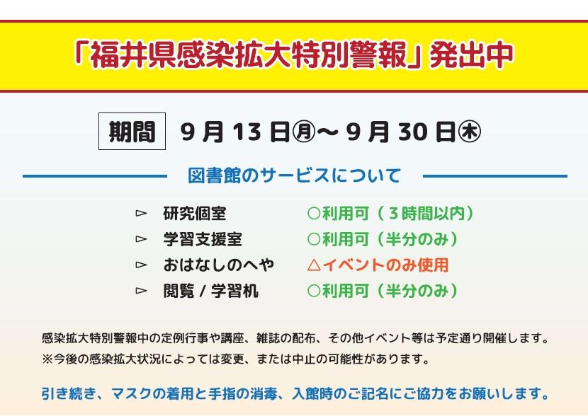 「福井県感染拡大特別警報」が発出されましたので、コロナウイルス感染拡大防止のため、9月13日(月曜日) から9月30日(木曜日)までの間、下記のとおり図書館サービスを制限または変更いたします。ご理解とご協力のほど、よろしくお願いいたします。