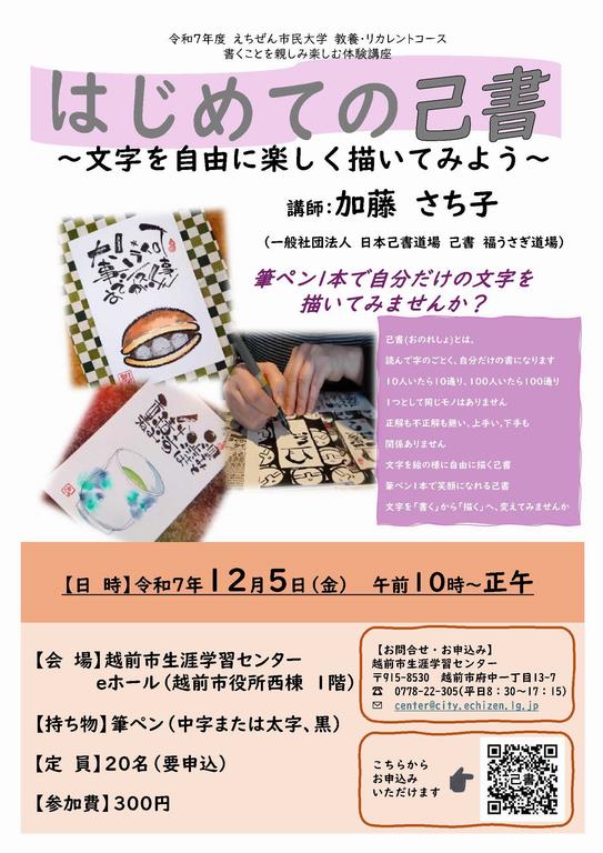 えちぜん市民大学「はじめての己書」を開催します。