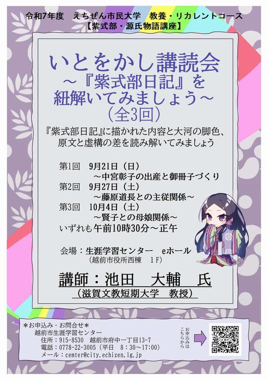 今年度も、滋賀文教短期大学 池田大輔氏を講師にお迎えし、『紫式部日記』を紐解きながら、昨年の大河ドラマの世界との違いなどを学びます。毎年、人気の講座です。皆様のお申込みをお待ちしております。