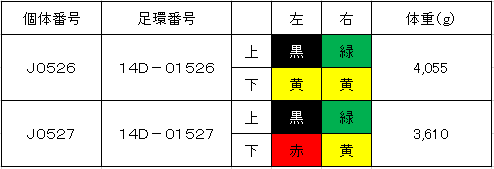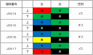 ※J0161は、1970年に越前市(旧 武生市)に飛来した武生(コウちゃん)のひ孫
