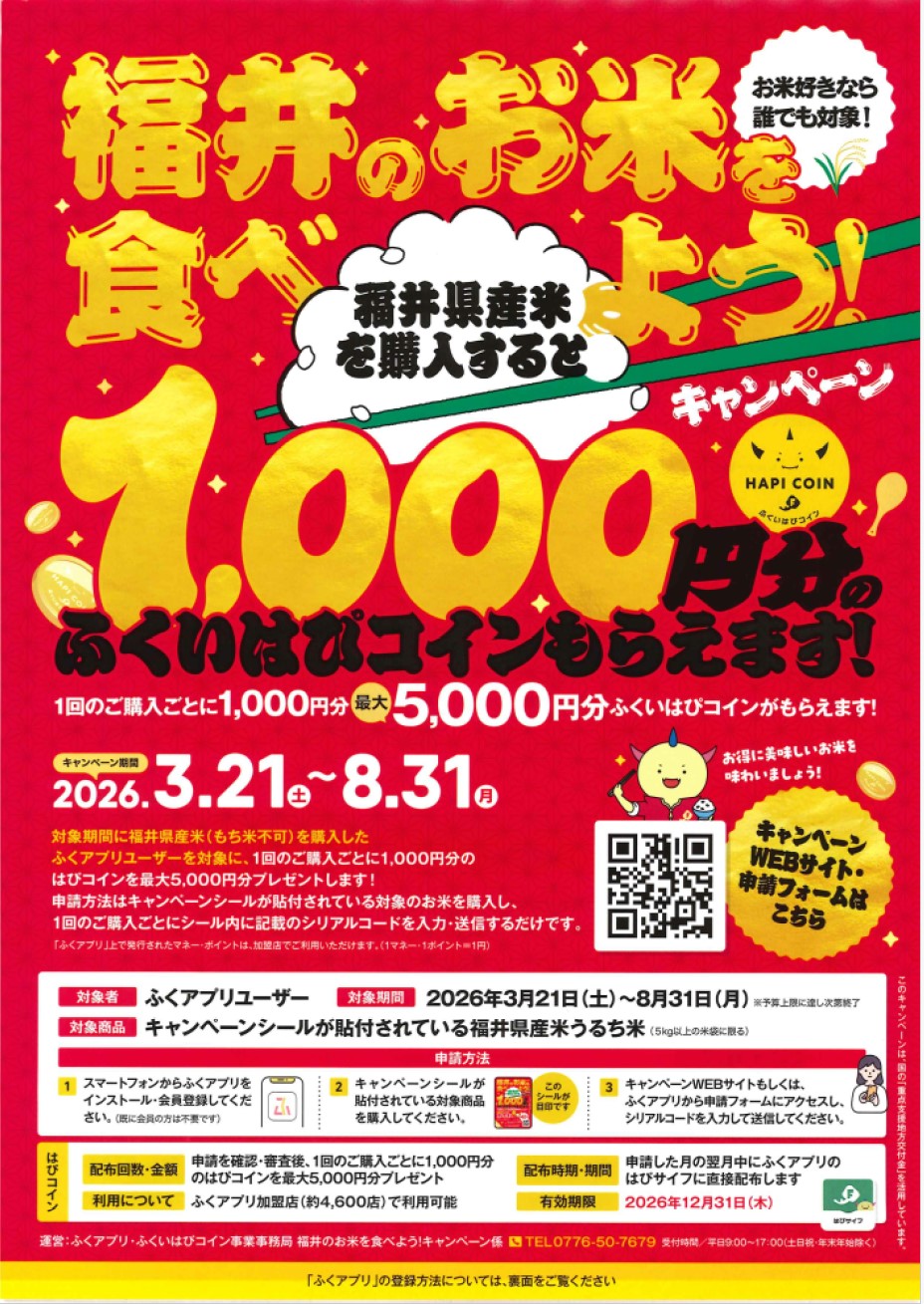 県産米を購入した場合に、1回あたり1,000円分(最大5回)のはぴコインをプレゼント